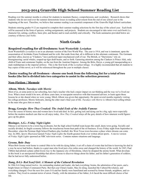 2013 2014 Granville High School Summer Reading List