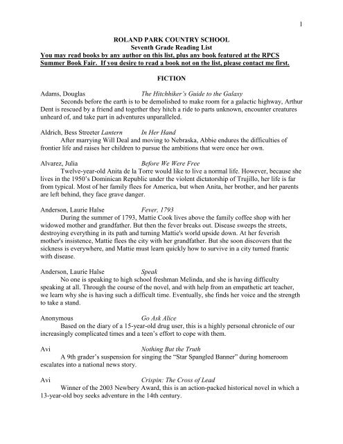 Suggested Summer Reading List Roland Park Country School