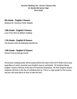 Honors English 9 Summer Reading Hamilton Southeastern Schools