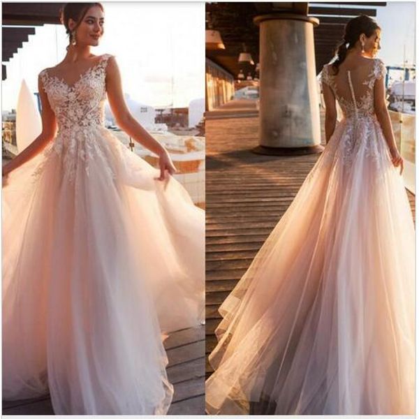 Elegant Blush Pink Lace Appliques A Line Wedding Dresses Sheer Scoop Neck Tulle Covered Button Tulle Long Wedding Gowns Customize Mermaid Wedding