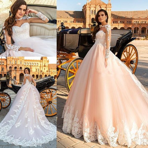 Discount Blush Pink Wedding Dresses V Neck Long Sleeves Illusion Bodice Appliques Tulle Backless Wedding Gowns Bridal Dresses Chapel Train Simple