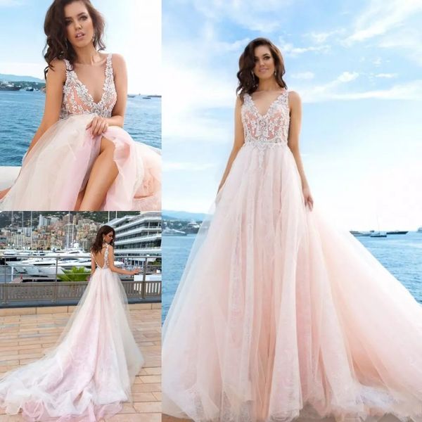Discount Sexy Blush Pink A Line Wedding Dresses V Neck Lace Applique Tulle Floor Length Beach Wedding Bridal Gowns Custom Made Wedding Dresses Simple