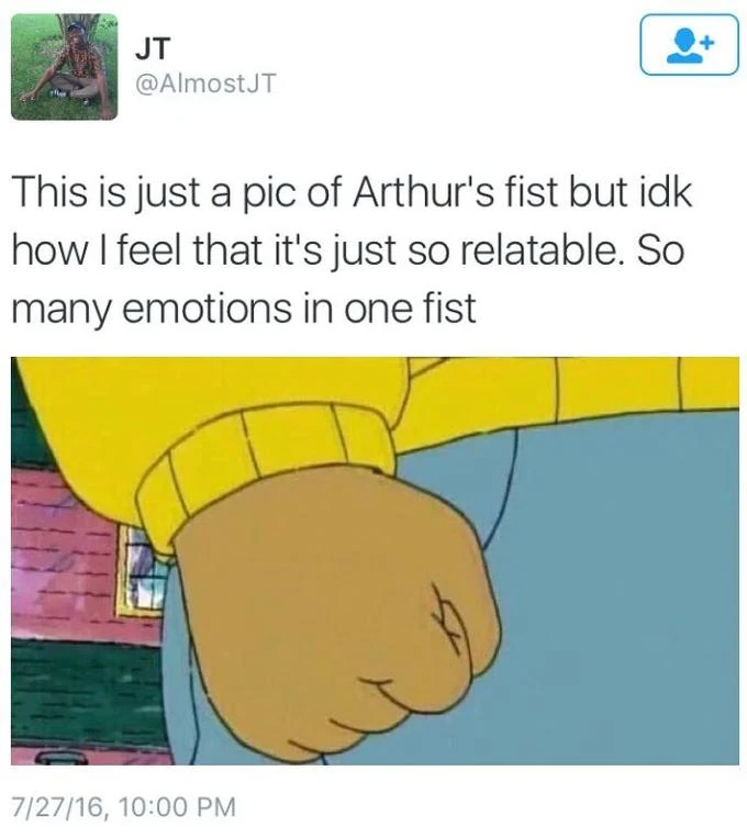 Arthur twitter meme. We would like to show you a description here but the site wont allow us. The hot new meme of this moment before the internets collective attention spans reset is the arthur fist meme. It all started when twitter user almostjt pointed out the simple poignancy.