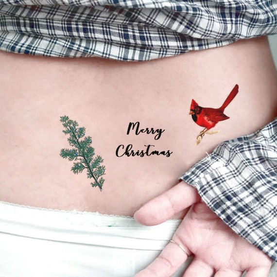 Christmas Pack N 3 Set Of 3 Temporary Tattoos Red Cardinal Pine Branch And Merry Christmas Calligraphy Holiday Gift Unisex Cheap